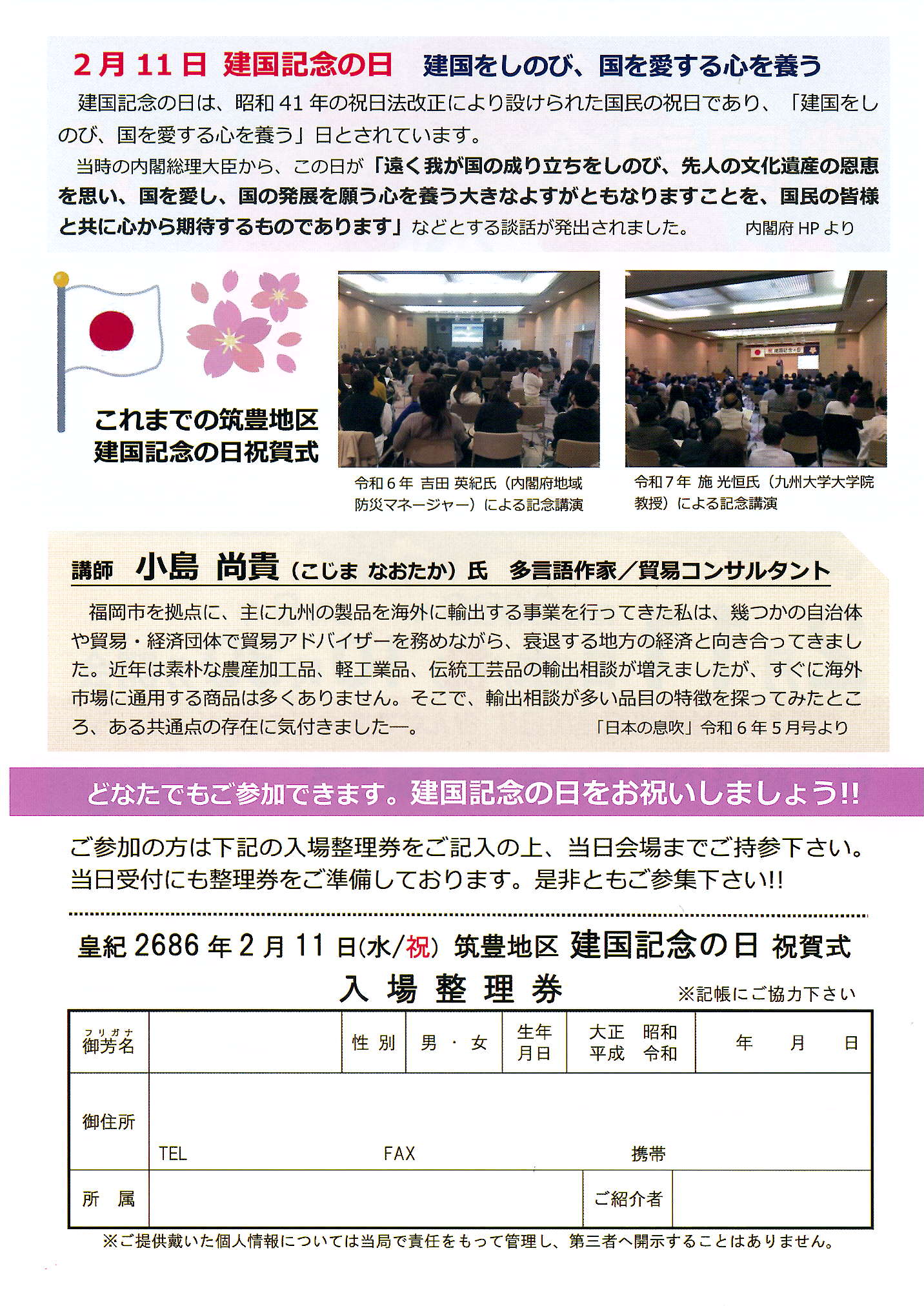 【福岡県】2月11日 日本の建国をお祝いする市民の集い 久留米