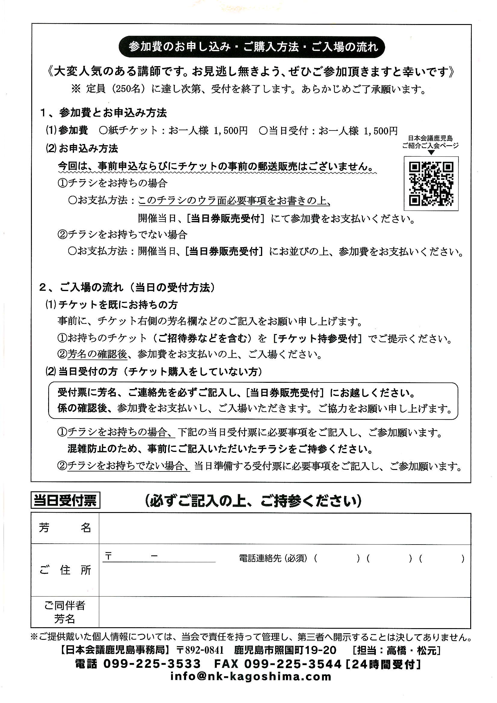 ①チラシ裏面に必要事項を記入の上、[当日券販売受付]にて参加費をお支払いください。