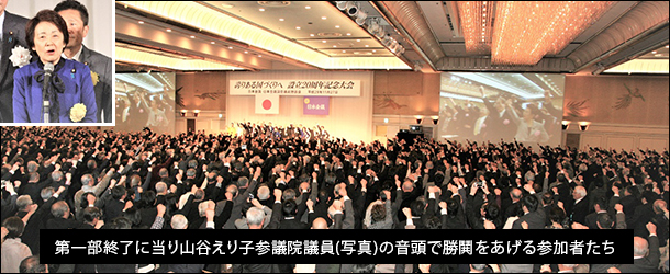 この20年の足跡を振り返り、国家の諸課題に引き続き取り組むと共に、先の衆院選の結果を受け新たなステージに立った憲法改正運動の前進を誓い合う大会となった。