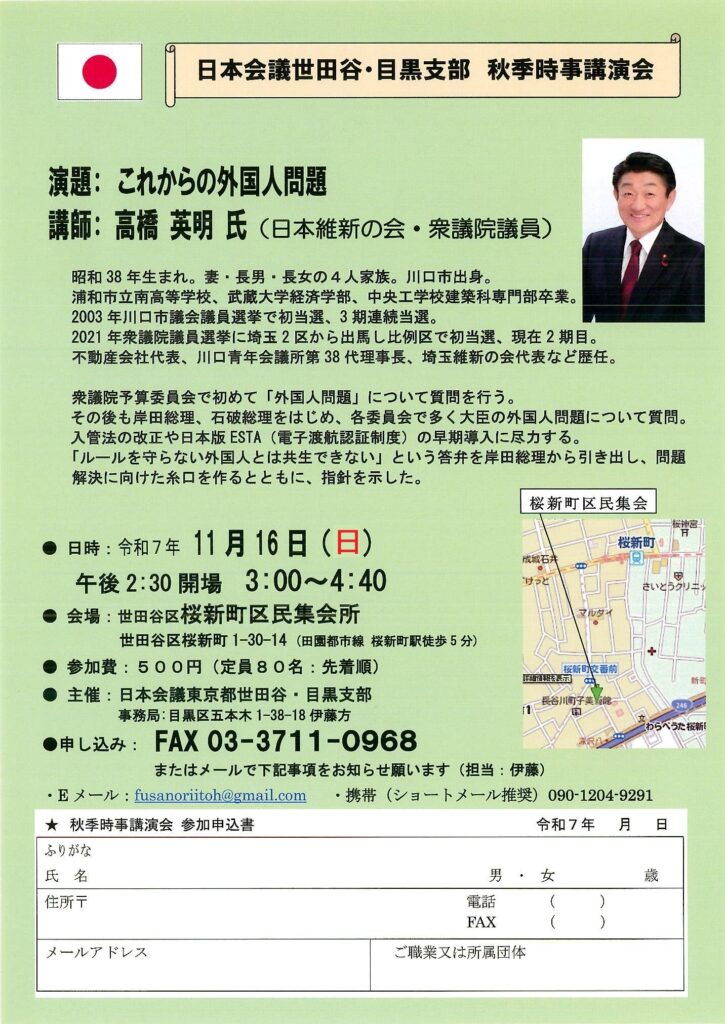 【東京都】11月16日 日本会議世田谷・目黒支部 秋季時事講演会