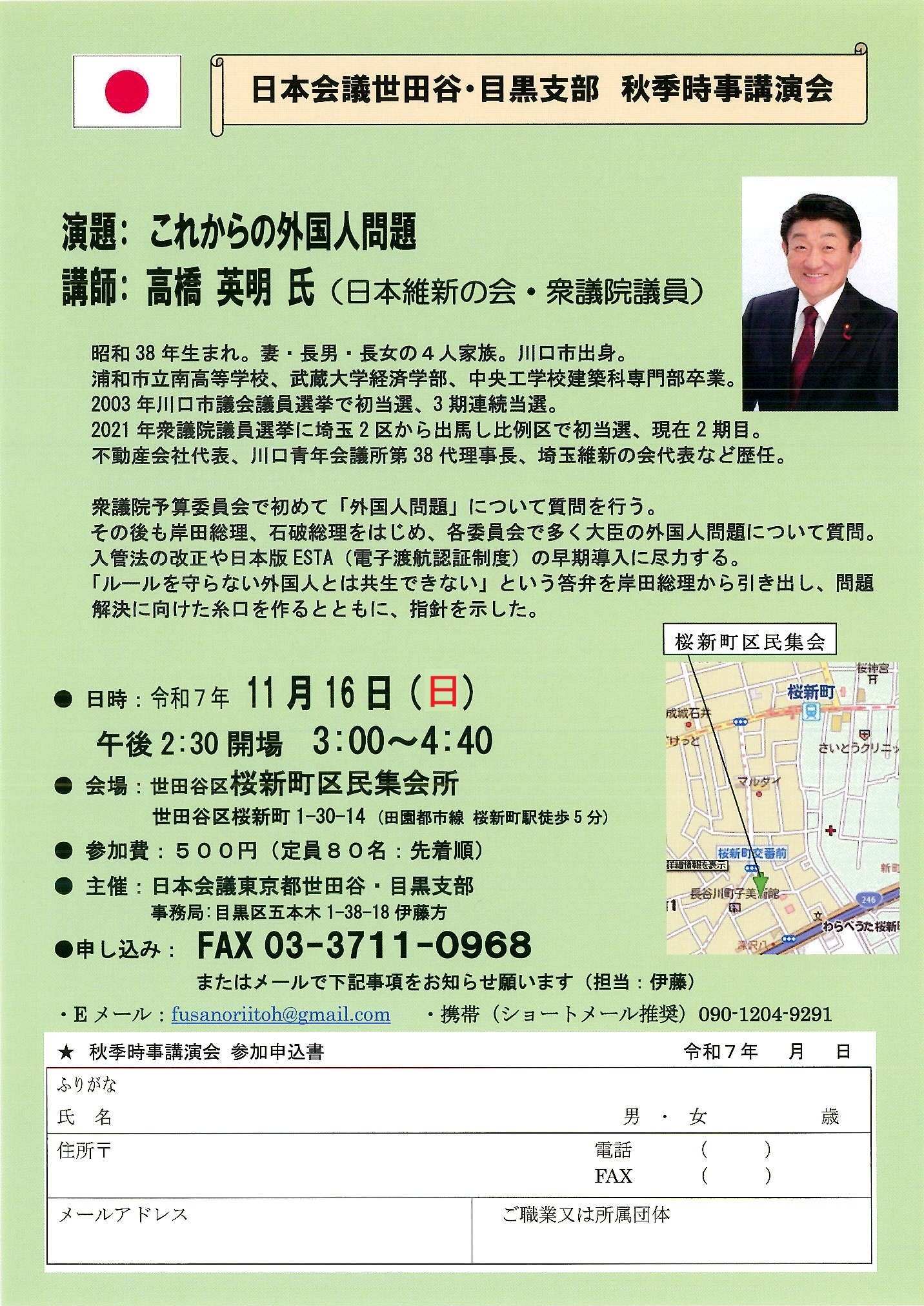 ◎講師:高橋 英明 氏(日本維新の会・衆議院議員)