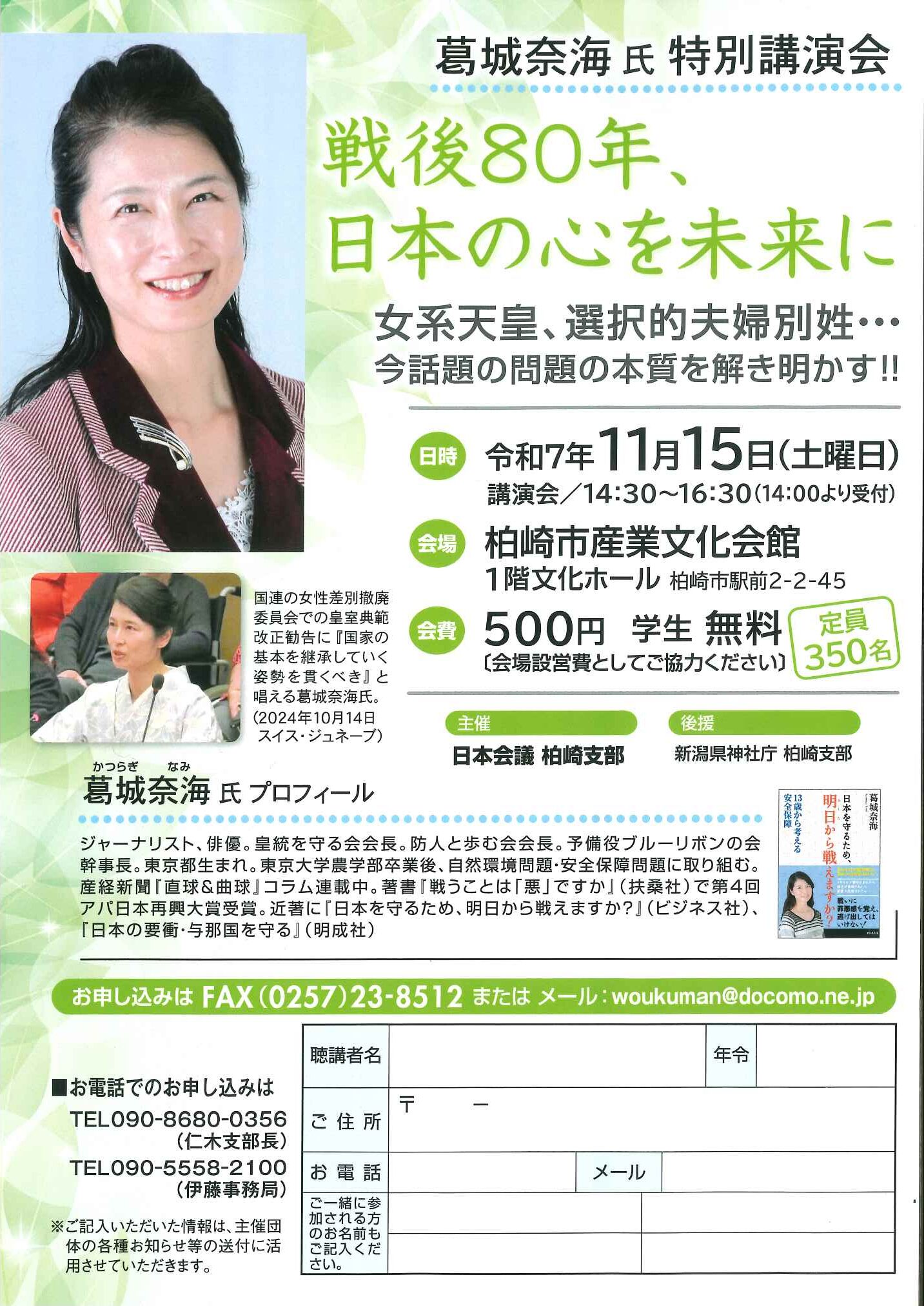 【新潟県】11月15日 葛城奈海氏 特別講演会 戦後80年、日本の心を未来に