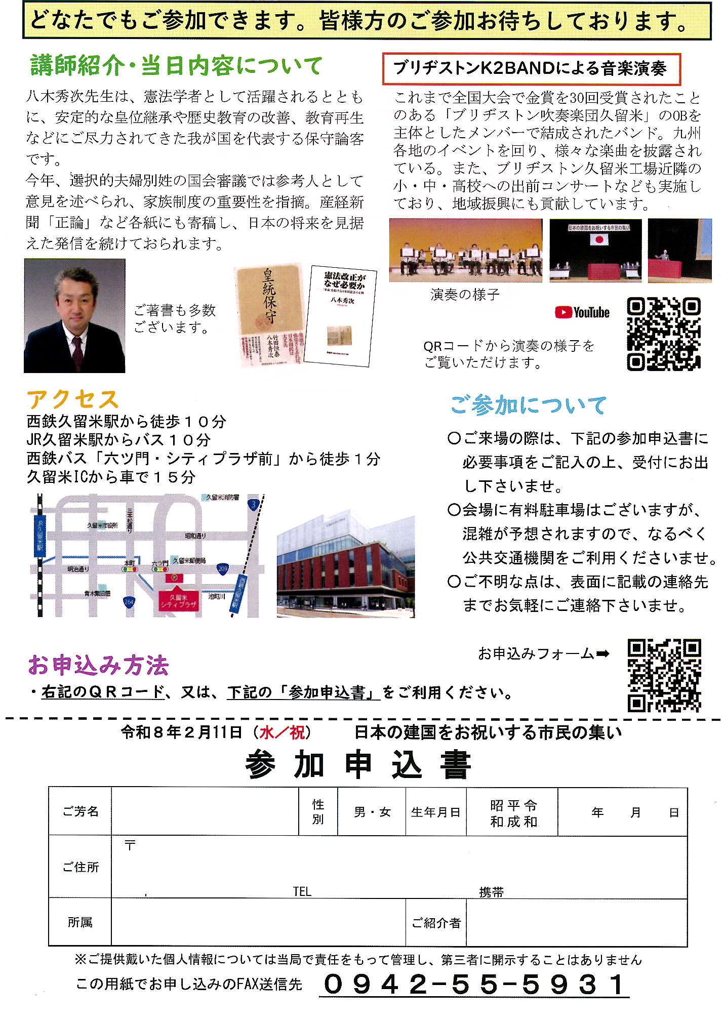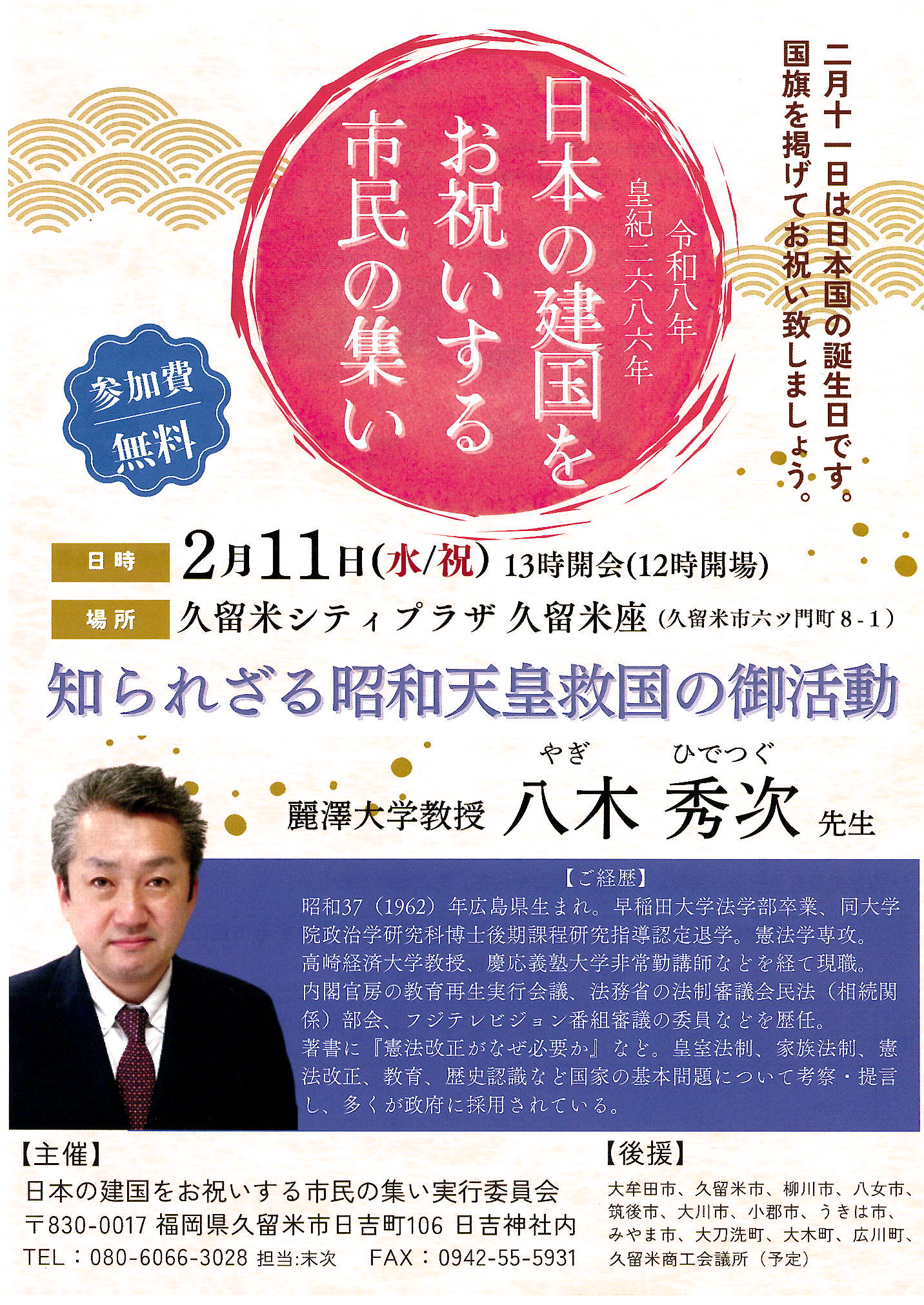 【福岡県】2月11日 日本の建国をお祝いする市民の集い 久留米