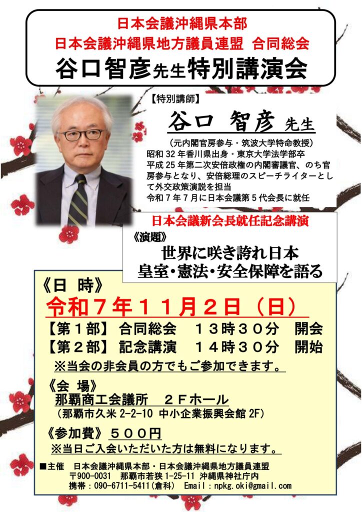【沖縄県・講演会】11月2日 谷口会長特別講演会(日本会議沖縄県本部・沖縄県地方議員連盟合同総会)